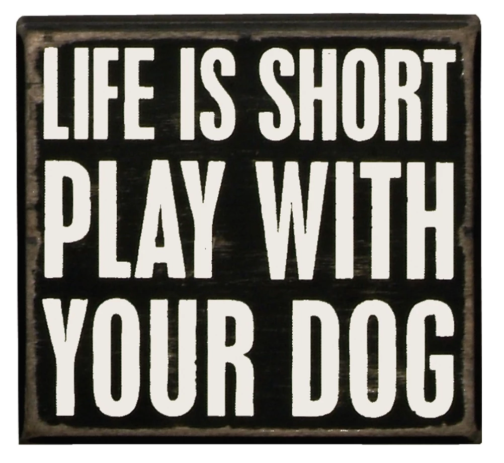 A classic black and white wooden box sign featuring a distressed “Life Is Short – Play With Your Dog” sentiment. Easy to hang or can free-stand alone.