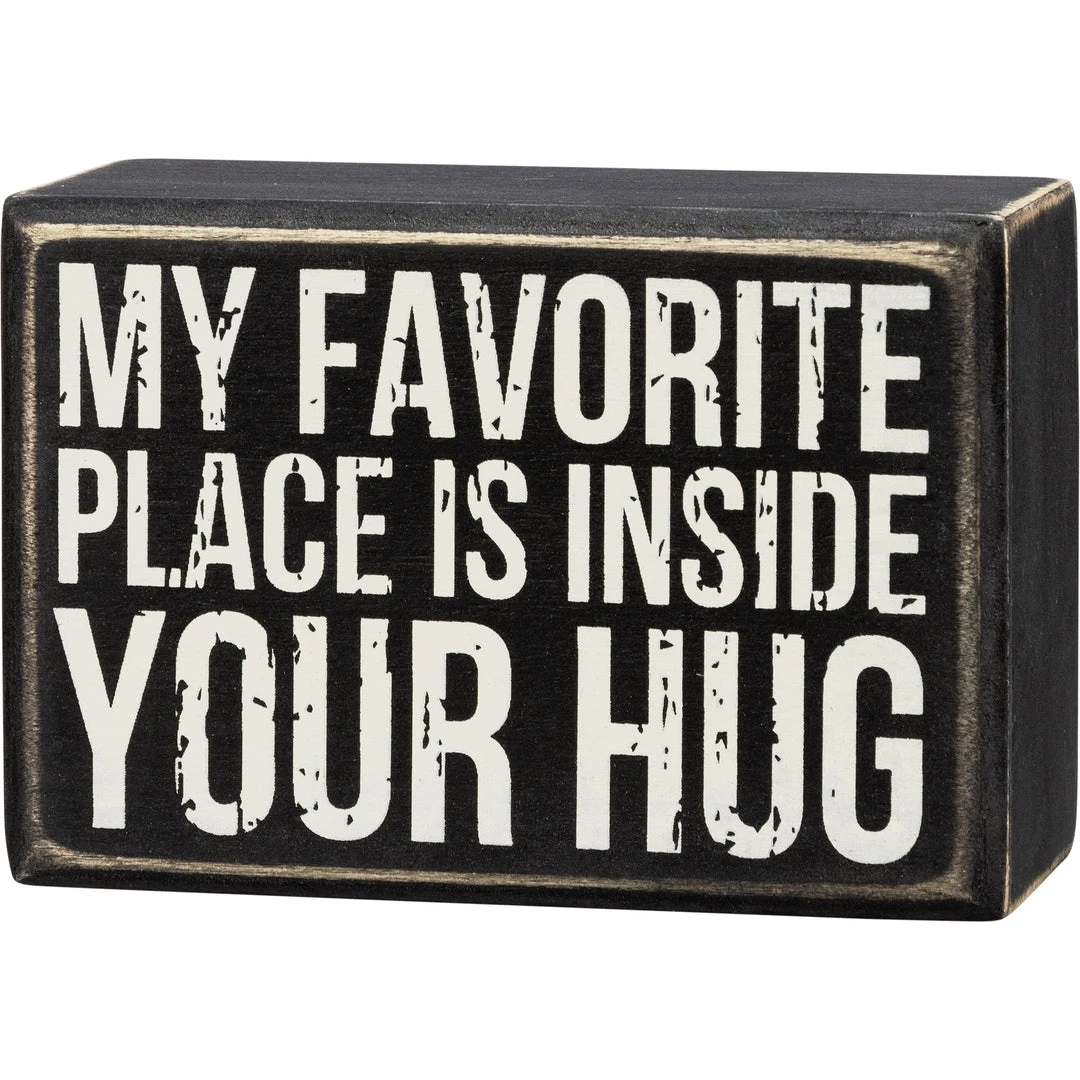 A classic wooden box sign featuring a “My Favorite Place Is Inside Your Hug” sentiment. Easy to hang or can free-stand alone.