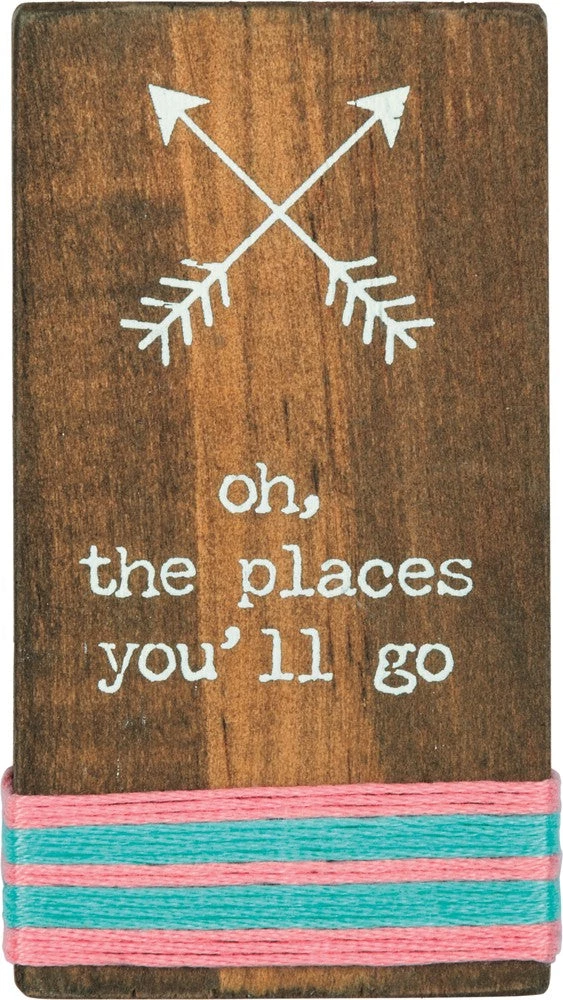 Wooden block featuring “Oh, The Places You’ll Go” sentiment with feathered arrows design and layered horizontal hand-stitched string border. Contains strong back magnet or can free-stand alone. Measures 1.75″ x 3.25″ x 0.50″