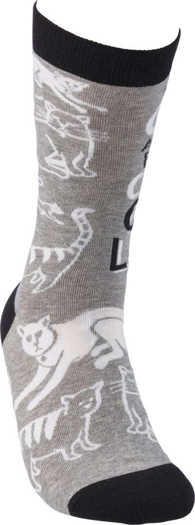 Colorfully printed socks lending “One Cat Away From Being A Crazy Cat Lady” with cat designs. One size fits most. Cotton, nylon, spandex. One size fits most.