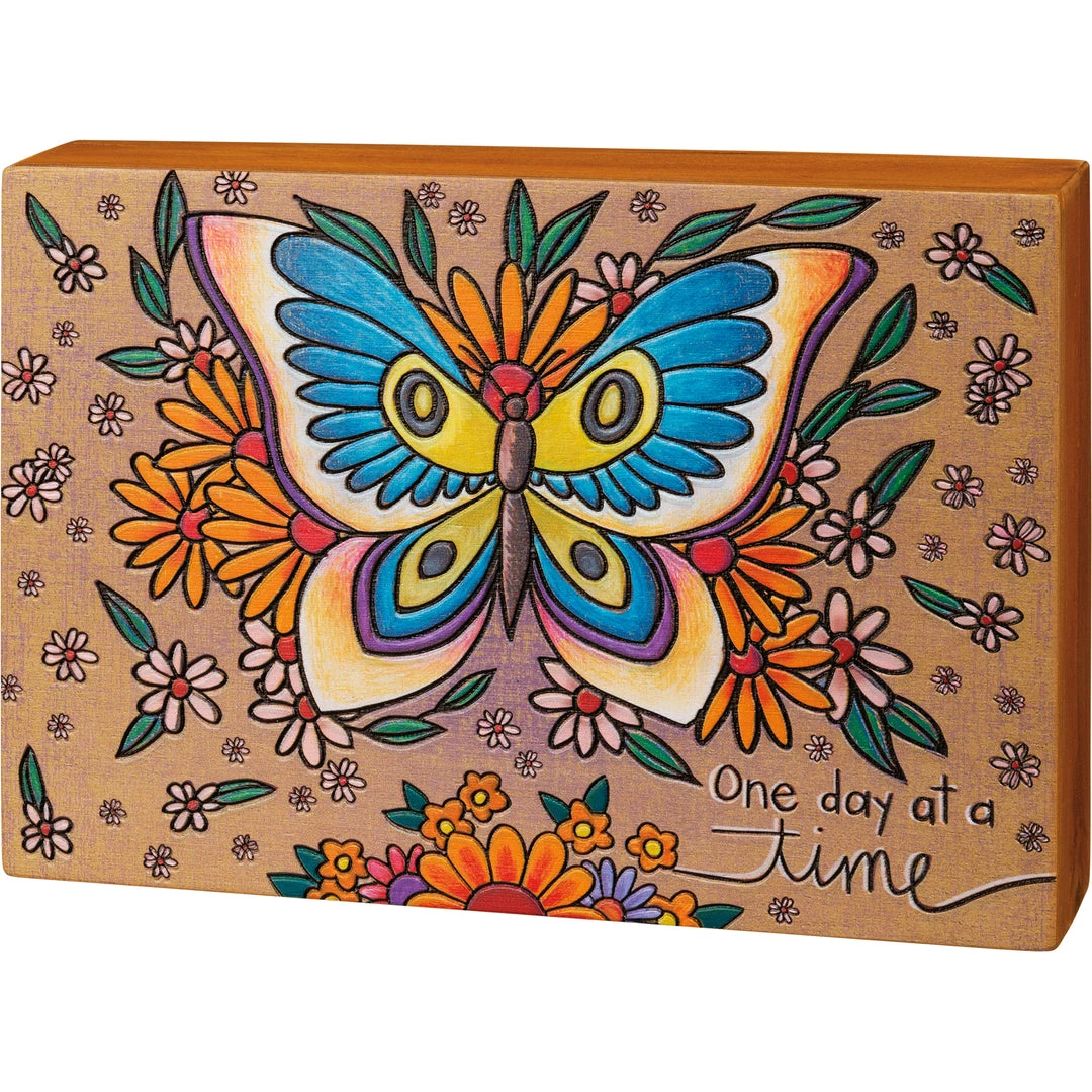 A wooden box sign featuring wood burned butterfly and flower designs and a “One Day At A Time” sentiment. Easy to hang via predrilled keyhole slot or can free-stand alone.
