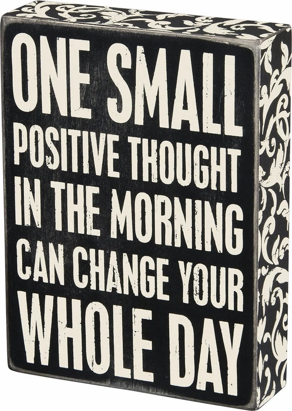 A classic black and white wooden box sign featuring a distressed “One Small Positive Thought In The Morning Can Change Your Whole Day” sentiment with patterned trim. Easy to hang or can free-stand alone. 6″ x 8″ x 1.75″
