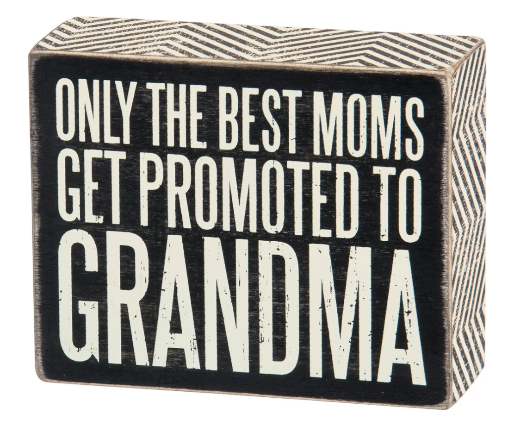 A classic black and white wooden box sign featuring a distressed “Only The Best Moms Get Promoted To Grandma” sentiment with zigzag trim designs. Easy to hang or can free-stand alone.