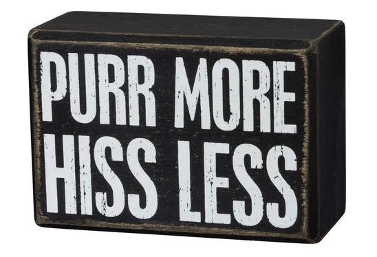 A classic black and white box sign featuring a distressed “Purr More – Hiss Less” sentiment. Easy to hang or can free-stand alone. 4″ x 2.75″ x 1.75″