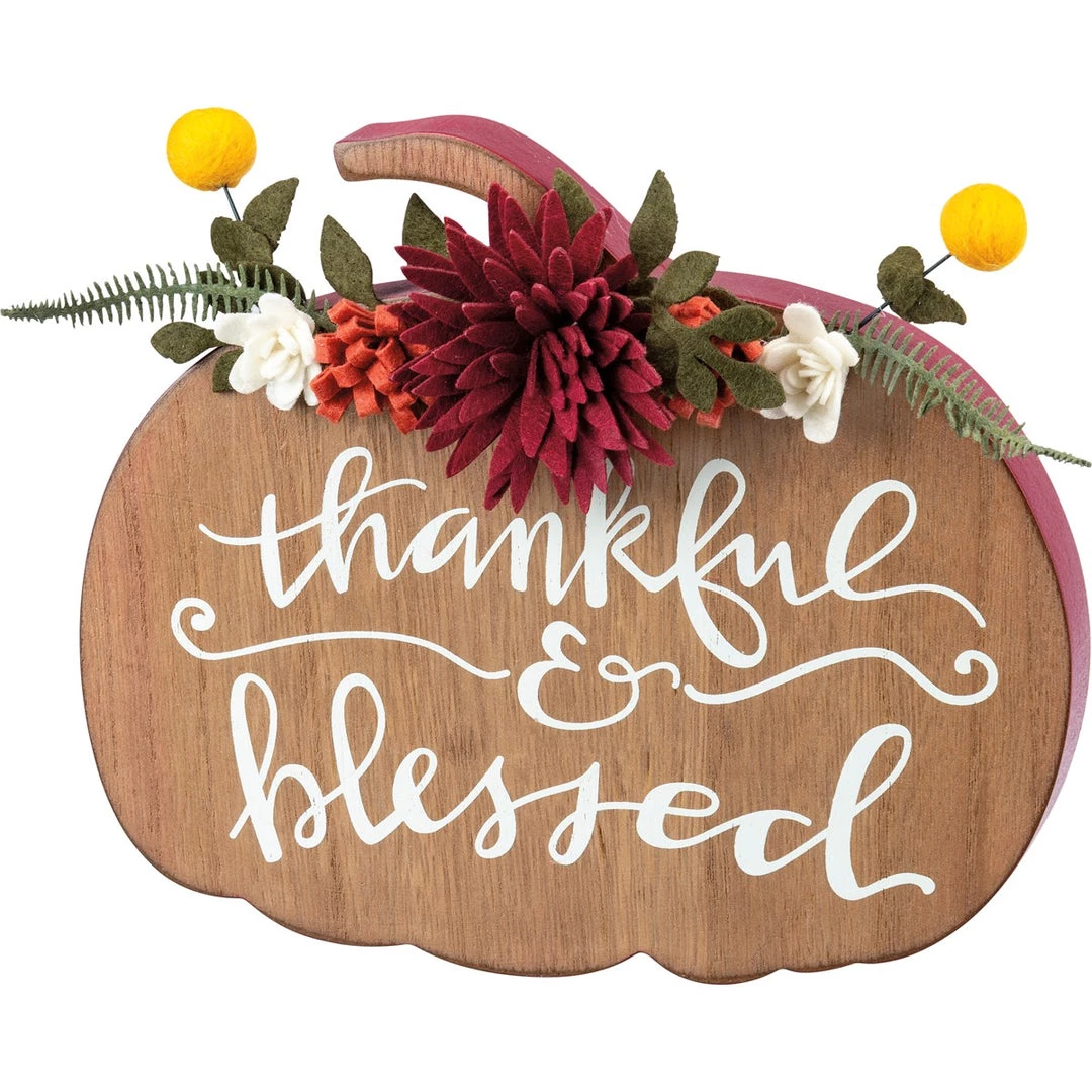A wooden chunky sitter featuring a hand lettered “Thankful & Blessed” sentiment with felt floral additions in a fall-inspired palette. 8″ x 6.75″ x 1″