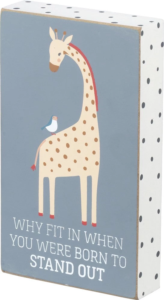 Add personality and character to any space with this wooden box sign, featuring a giraffe and bird design, playful “Why Fit In When You Were Born To Stand Out” sentiment, and polka dot patterned trim. Easy to hang or can free-stand alone. 3.50″ x 6″ x 1″