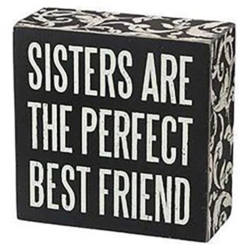 A classic black and white wooden box sign featuring a distressed “Sisters Are The Perfect Best Friend” sentiment with floral trim designs. Easy to hang or can free-stand alone. 4″ x 4″