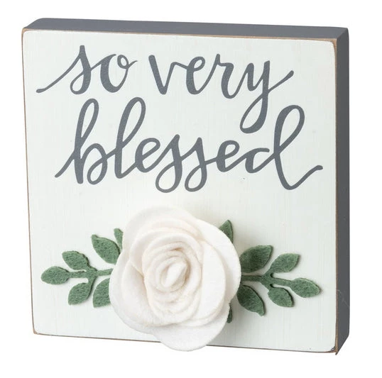 A chic statement for the season, a wooden block sign featuring a hand lettered “So Very Blessed” sentiment with felt flower additions in a neutral palette. Contains a back predilled keyhole for easy hanging or can free-stand alone. Complements well with coordinating pieces in collection for a cohesive seasonal display. 5″ x 5″ x 1″