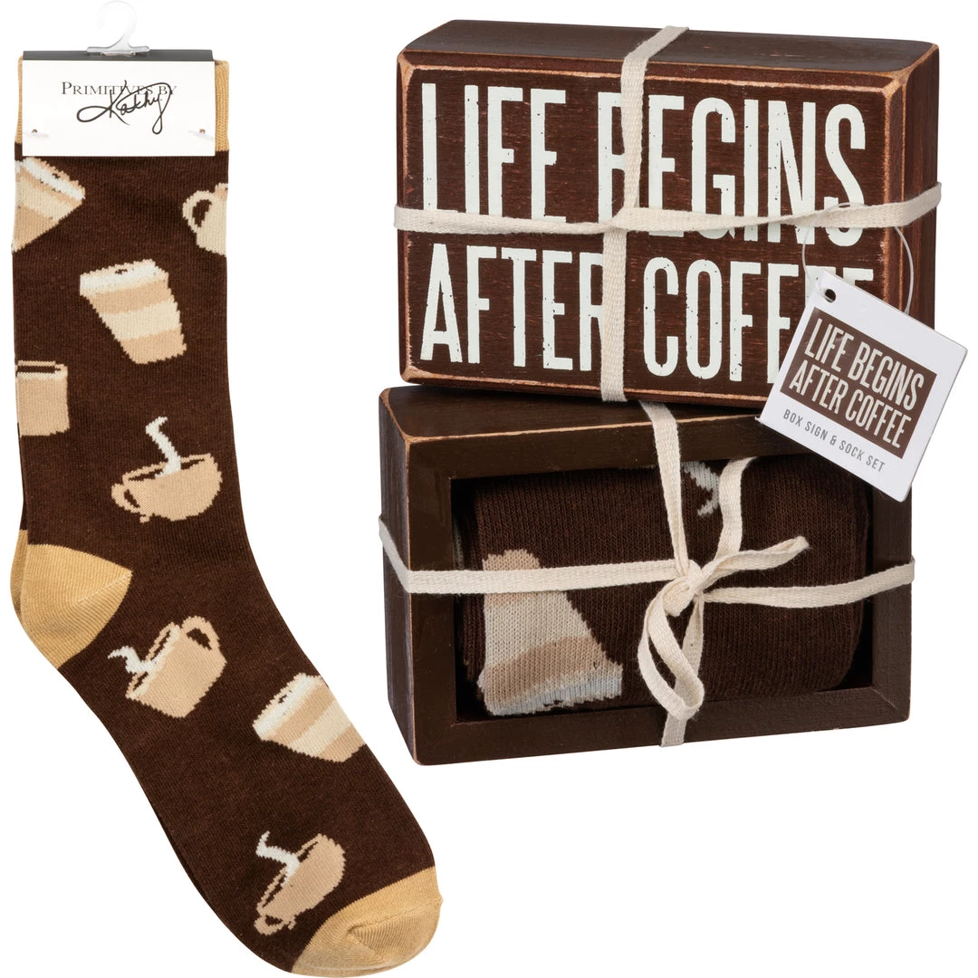 Primitives By Kathy Socks! Socks! Socks! Life Begins After Coffee Socks & Box Sign Gift Set