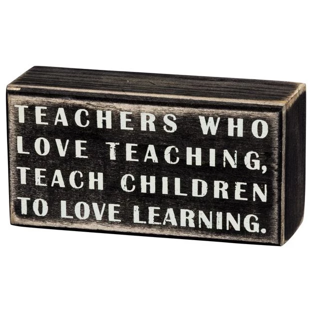 A classic black and white wooden box sign featuring a distressed “Teachers Who Love Teaching Teach Children To Love Learning” sentiment. Easy to hang or can free-stand alone.