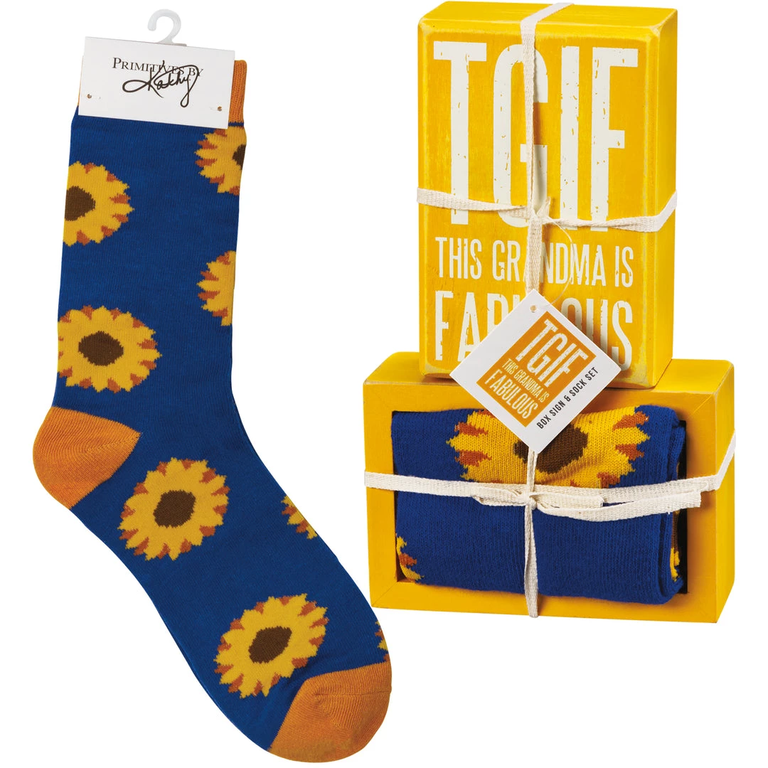 A perfectly giftable set including a colored box sign featuring a “TGIF This Grandma Is Fabulous” sentiment, and a pair of colorfully printed socks with complementing floral designs. Socks are cotton, nylon, and spandex and are machine-washable. One size fits most. Box sign is easy to hang or can free-stand alone. Socks come neatly rolled inside box sign and secured with tied cotton tape ribbon.