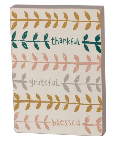 A wooden block sign created with intricate age-old block carving and printmaking techniques. Features linear leaf designs with “Thankful – Grateful – Blessed” sentiment in a neutral palette. Contains predrilled back keyhole for easy hanging or can free-stand alone. Complements well with coordinating pieces in collection for a charming spring display. 5″ x 7″ x 1″