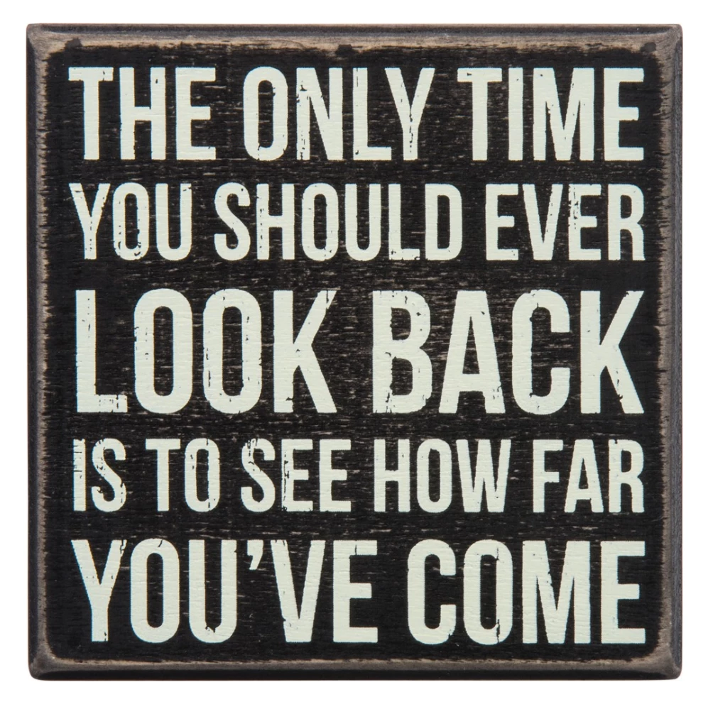 A classic black and white wooden box sign featuring a distressed “The Only Time You Should Ever Look Back Is To See How Far You’ve Come” sentiment. Easy to hang or can free-stand alone.