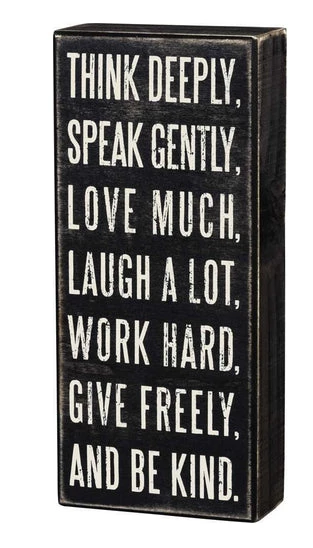 A classic black and white wooden box sign featuring a distressed “Think Deeply, Speak Gently, Love Much, Laugh A Lot, Work Hard, Give Freely, And Be Kind” sentiment. Easy to hang or can free-stand alone. 4″ x 9″ x 1.75″