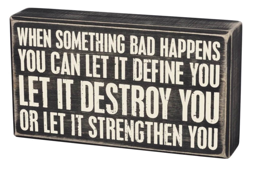 A classic black and white wooden box sign featuring a distressed “When Something Bad Happens You Can Let It Define You – Let It Destroy You – Or Let It Strengthen You” sentiment. Easy to hang or can free-stand alone.