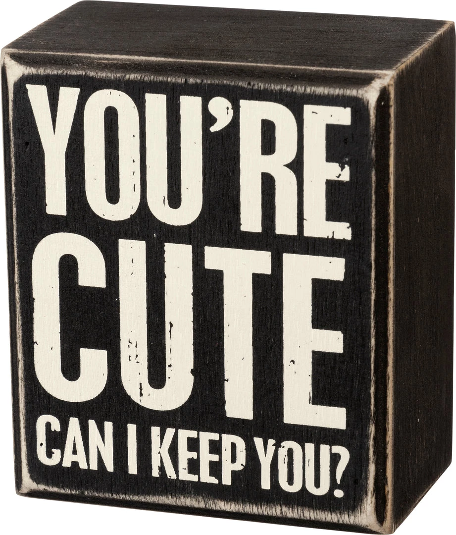 Classic and timeless, a black and white wooden box sign featuring a distressed “You’re Cute – Can I Keep You?” sentiment. Easy to hang or can free-stand alone. 3″ x 3.50″ x 1.75″