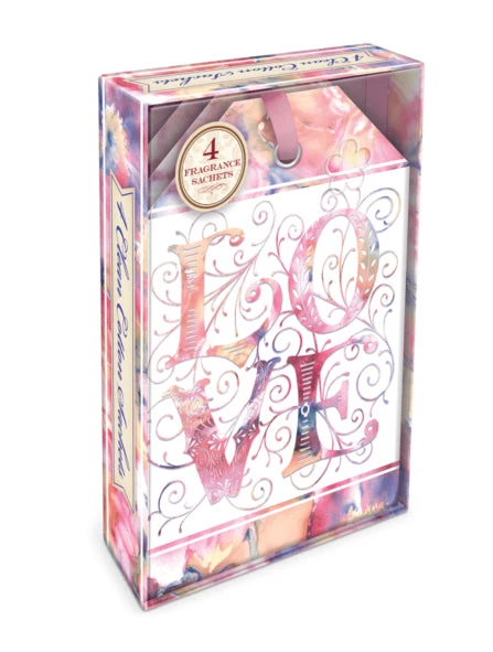 Meet the perfect aromatic companion for your closet or dresser. Each box contains 4 scented sachets with gold or silver metallic grommet and coordinating ribbon for hanging.