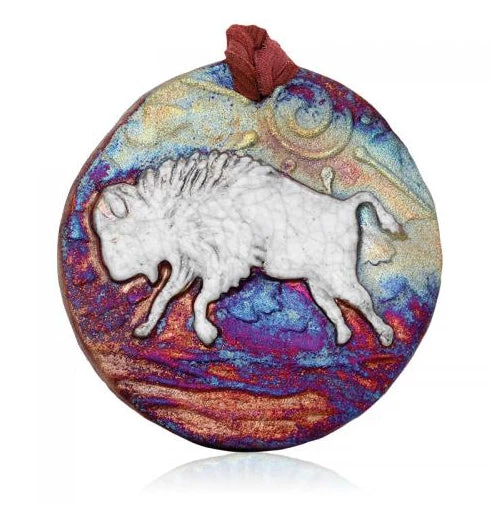 Raku Pottery is light sensitive and will fade if left in direct sunlight. Each piece is unique in design and colors and may not look like the photos, please contact us if you have any questions before purchasing this gift. Each measures 3″ diameter and is adorned with a colorful hand painted 3” silk ribbon for decorating a Christmas tree or wall. Comes with a gift box and information card.
