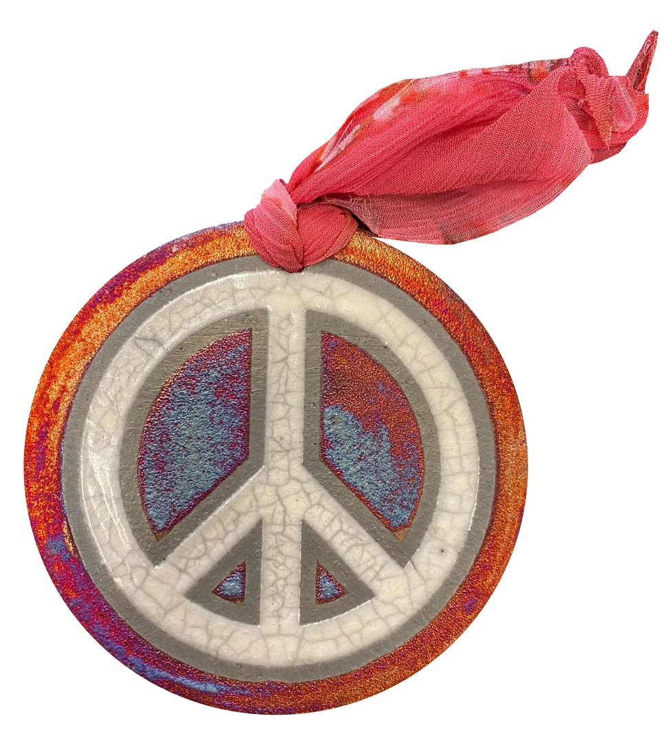 Raku Pottery is light sensitive and will fade if left in direct sunlight. Each piece is unique in design and colors and may not look like the photos, please contact us if you have any questions before purchasing this gift. Each is adorned with a colorful hand painted 3” silk ribbon for decorating a Christmas tree or wall. Comes with a gift box and information card.