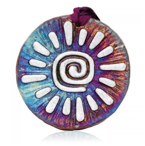 Raku Pottery is light sensitive and will fade if left in direct sunlight. Each piece is unique in design and colors and may not look like the photos, please contact us if you have any questions before purchasing this gift. Each measures 3″ diameter and is adorned with a colorful hand painted 3” silk ribbon for decorating a Christmas tree or wall. Comes with a gift box and information card.