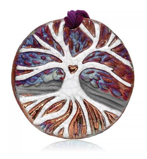 Raku Pottery is light sensitive and will fade if left in direct sunlight. Each piece is unique in design and colors and may not look like the photos, please contact us if you have any questions before purchasing this gift. Each measures 3″ diameter and is adorned with a colorful hand painted 3” silk ribbon for decorating a Christmas tree or wall. Comes with a gift box and information card.