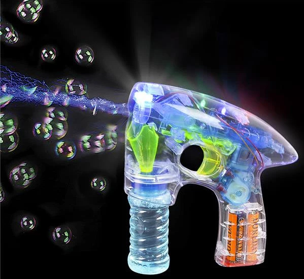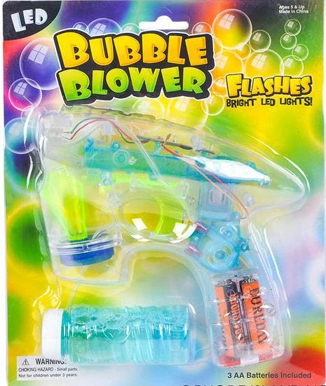 7’’ Transparent Light-Up Bubble Blaster, comes with one bottle of bubble solution and batteries. For ages 5 and up.