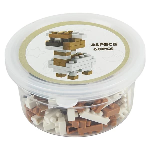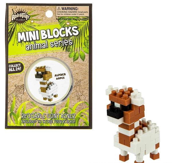 From Adventure Planet’s Animal Series, it’s a mini blocks Alpaca! 60 small colored blocks fit together to create a 3D, stand-up Alpaca, includes a container to store all the pieces. Fun gift for kids! Recommended for ages 3+.