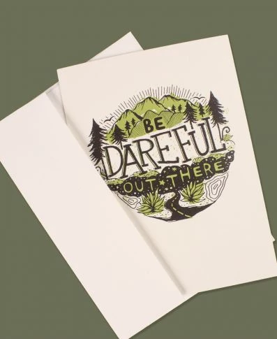 Follow your dreams and explore the world, but remember to be dareful out there! Share all your cool adventures with friends in this Be Dareful Out There greeting card. A hand-drawn mountain scene is printed on the front. Blank inside, so send this design to family, friend, co-worker, or yourself. Blank inside with a matching envelope. Made in the USA. 100% post consumer recycled paper. 5 x 7 inches, by Soul Flower.