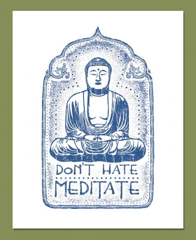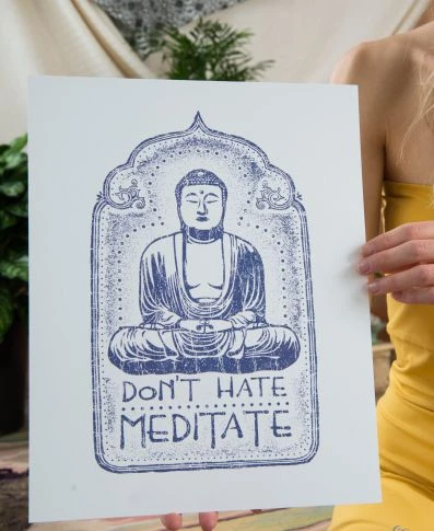 Calm your mind and soul with this Don’t Hate Meditate art print. A peaceful hand drawn Buddha spreads positive vibes and the words, ‘Don’t Hate, Mediate.’ Display this eco-friendly poster in any place of serenity and spread the word. Made in the USA. Digitally printed on 100% recycled heavyweight paper. Textured finish. 11 x 14 inches.
