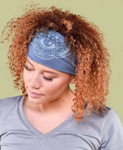 Protect your spirit from all negative vibes as you wear this Hamsa Hand Headband. Features a decorated Hamsa Hand printed on an eco blue fabric to ease your soul. Made in the USA. 50% organic cotton, 50% recycled plastic (from recycled beverage bottles). 9 inches wide by 8 inches tall (laying flat) – fabric can stretch from 18 to 26 inches in circumference. Eco Light Blue.