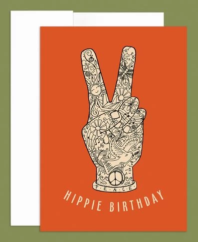 Hippie Birthday to you! Spread some peace, love & hippie-ness when you send off this Hippie Birthday Greeting Card to your favorite hippie! Features hand drawn doodles inside a peace fingers symbol on the front of the card and our Soul Flower logo on the back. Blank inside with a blank envelope. Made in the USA. 100% recycled paper. 5 x 7 inches.