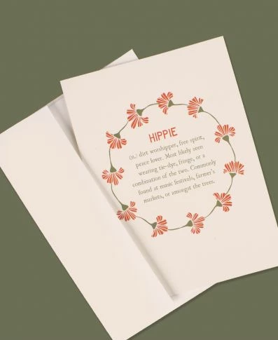 We all know one, a dirt worshipping, each loving free spirited HIPPIE! Find a hippie in your life and send them this hippie definition greeting card to spread lots of happy hippie vibes. Front of card reads: “Hippie (n.) dirt worshipper, free spirit, peace lover. Most likely seen wearing tie-dye, fringe, or a combination of the two. Commonly found at music festivals, farmer’s markets, or amongst the trees.” Blank inside with a matching envelope. Made in the USA. 100% post consumer recycled paper. 5 x 7 inches, by Soul Flower.