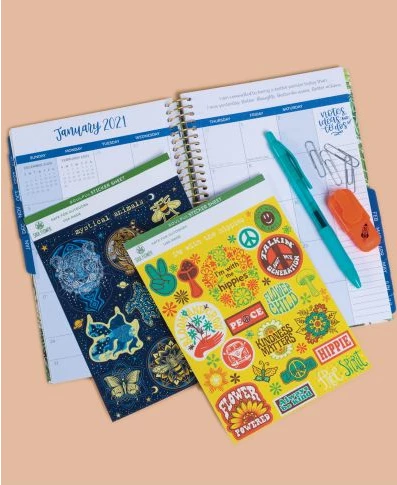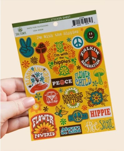 This I’m with the Hippies Sticker Sheet will put a smile on your face and let your free spirit shine! This adorable sheet contains an assortment of 20 small, peel-off hippie-inspired stickers. Ideal for your cellphone, notebook, water bottle, or laptop! Outdoor safe vinyl. 5 x 7 inches.