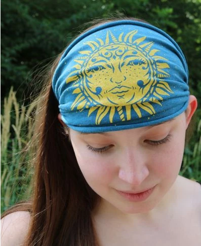 Love like a hippie and shine like the sun! Show off your inner glow every time you use this Sun Art Boho Headband. Made in the USA. 50% organic cotton, 50% recycled plastic (from recycled beverage bottles). 9 inches wide by 8 inches tall (laying flat) – fabric can stretch from 18 to 26 inches in circumference. Eco Ocean.