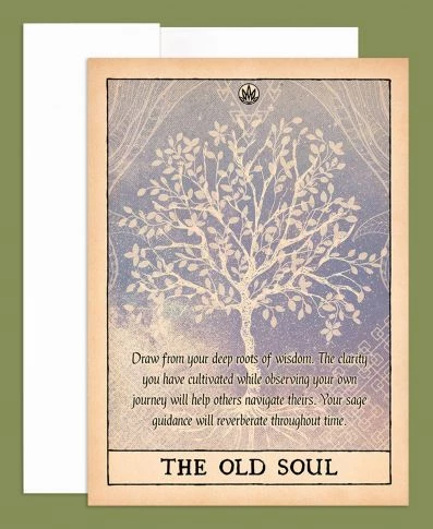 The Old Soul Greeting Card is ideal for anyone with an old soul, mind, and heart. The front of this eco-friendly card reads: Draw from your deep roots of wisdom. The clarity you have cultivated while observing your own journey will help others navigate theirs. Your sage guidance will reverberate throughout time. The Old Soul. Blank inside for your own message and comes with an envelope. Digitally printed in the USA on 100% post-consumer recycled paper. 5 x7 inches.