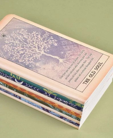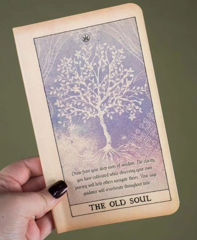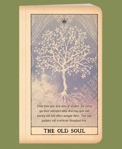 The Old Soul Recycled Notebook reads: Draw from your deep roots of wisdom. The clarity you have cultivated while observing your own journey will help others navigate theirs. Your sage guidance will reverberate throughout time. The Old Soul. Reveal your beautiful mind, loving heart, and wise spirit when you write or draw inside this eco-friendly notebook.
