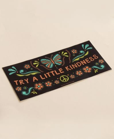 This mini bumper sticker will have you spreading a little kindness wherever you go. Outdoor safe vinyl sticker. Made in the USA. 6.5 x 3 inches.