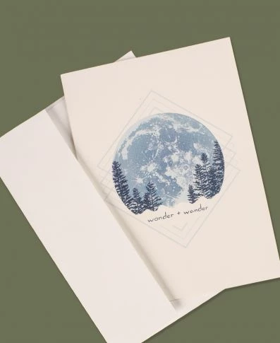 Wander often and wonder always. Let this eco-friendly greeting card inspire a new adventure for a friend or yourself. Features a nighttime moon scene with the words, ‘wonder + wander’, on the front. Blank inside with a matching envelope. Made in the USA. 100% post consumer recycled paper. 5 x 7 inches, by Soul Flower.