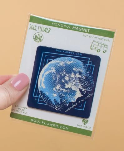 Made in the USA. Soul Flower mindful magnets contain 75% recycled content and are approximately 1/16th inch thick. Flexible 2.4 inch square. Each magnet will arrive in an eco-friendly clear bag with a recycled paper backing card. The clear bags are made from Polylactic Acid (PLA), sustainably derived from plants, and are commercially compostable.