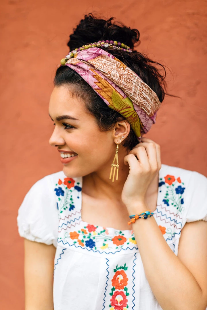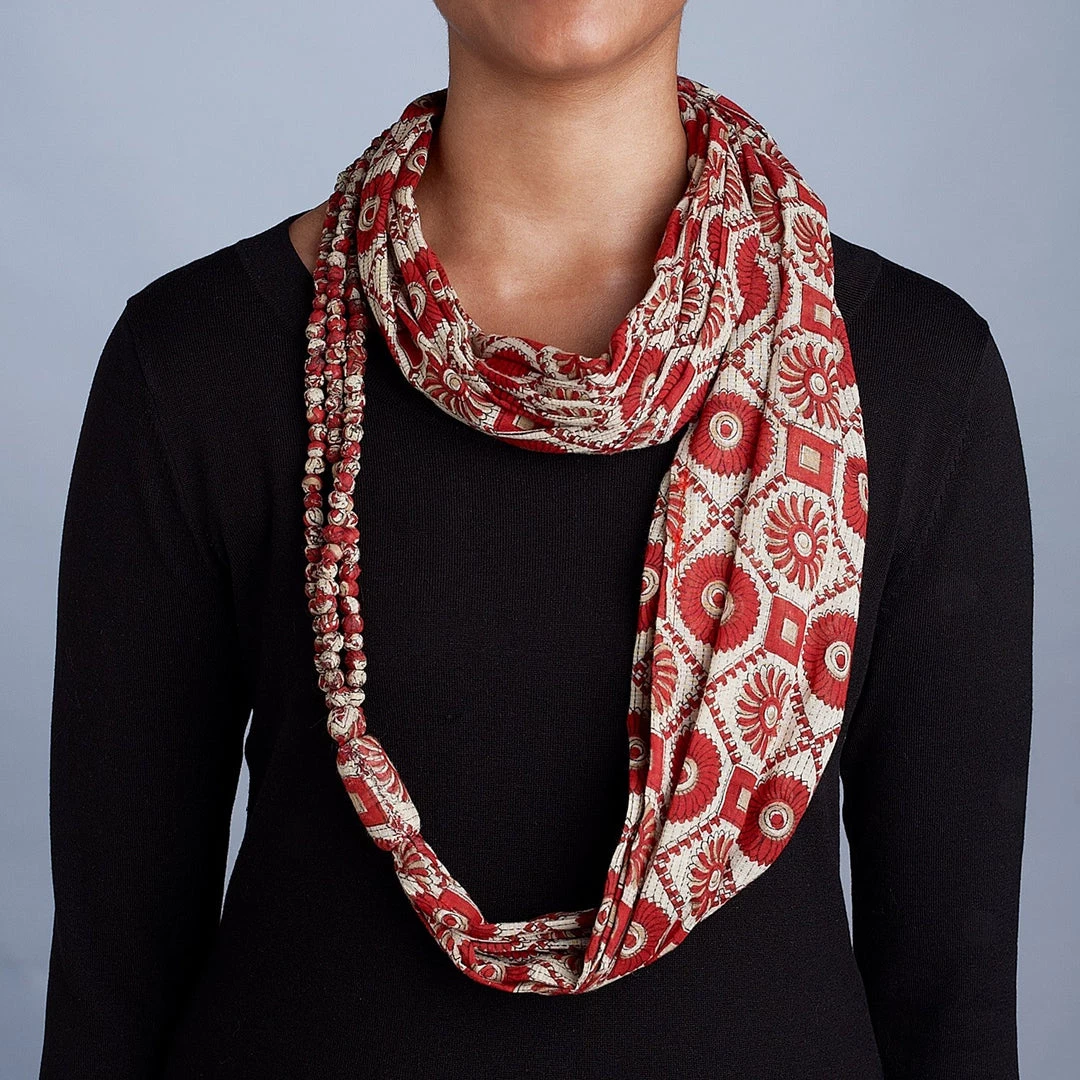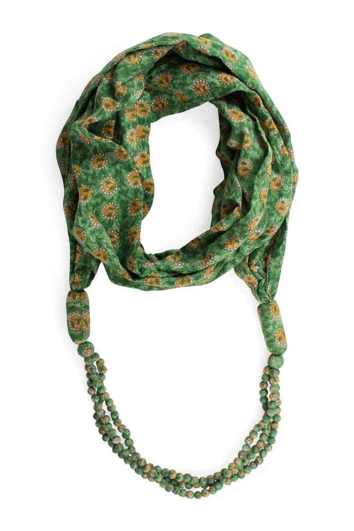 Is it a scarf? Or is it a necklace? This loop of sari material is decorated with beads, making it one of our most versatile accessories. And because it’s made from genuine recycled saris, no two are entirely alike. A beautiful Global Fair Trade gift.