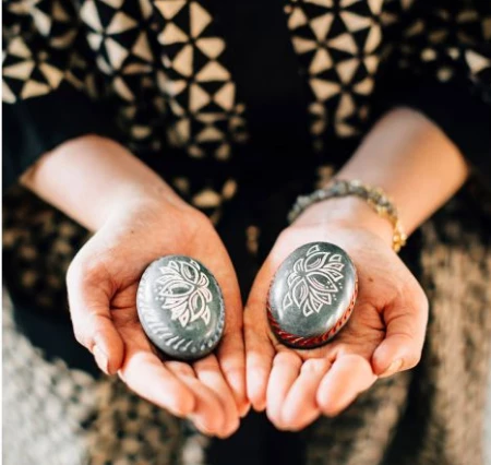 - Boxed set of 7 dark gray palewa stones with carved lotus design and painted teardrop pattern accented in colors corresponding to chakras