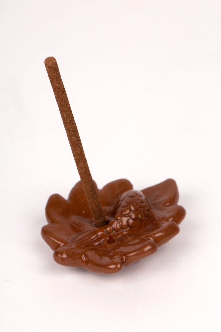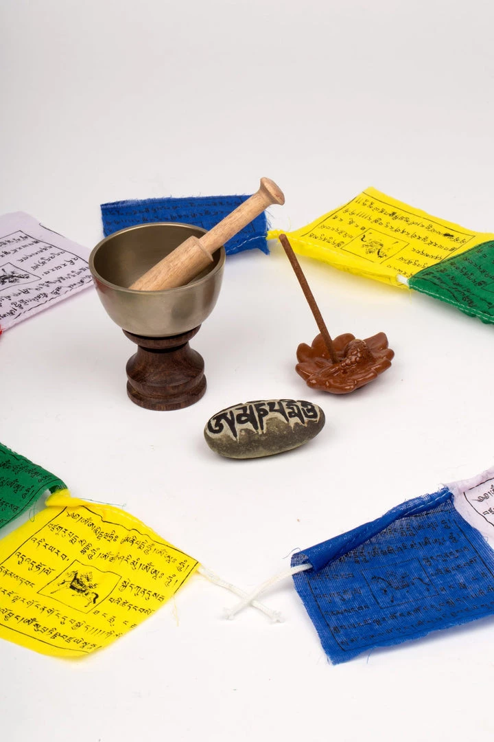 - Boxed meditation kit includes bronze singing bowl with saaj wood stand and stick, cotton prayer flags, ceramic incense holder in the shape of a leaf, Vata (lavender, cedarwood, clove) incense sticks, carved palewa stone