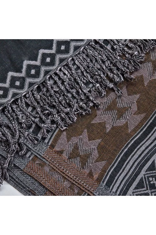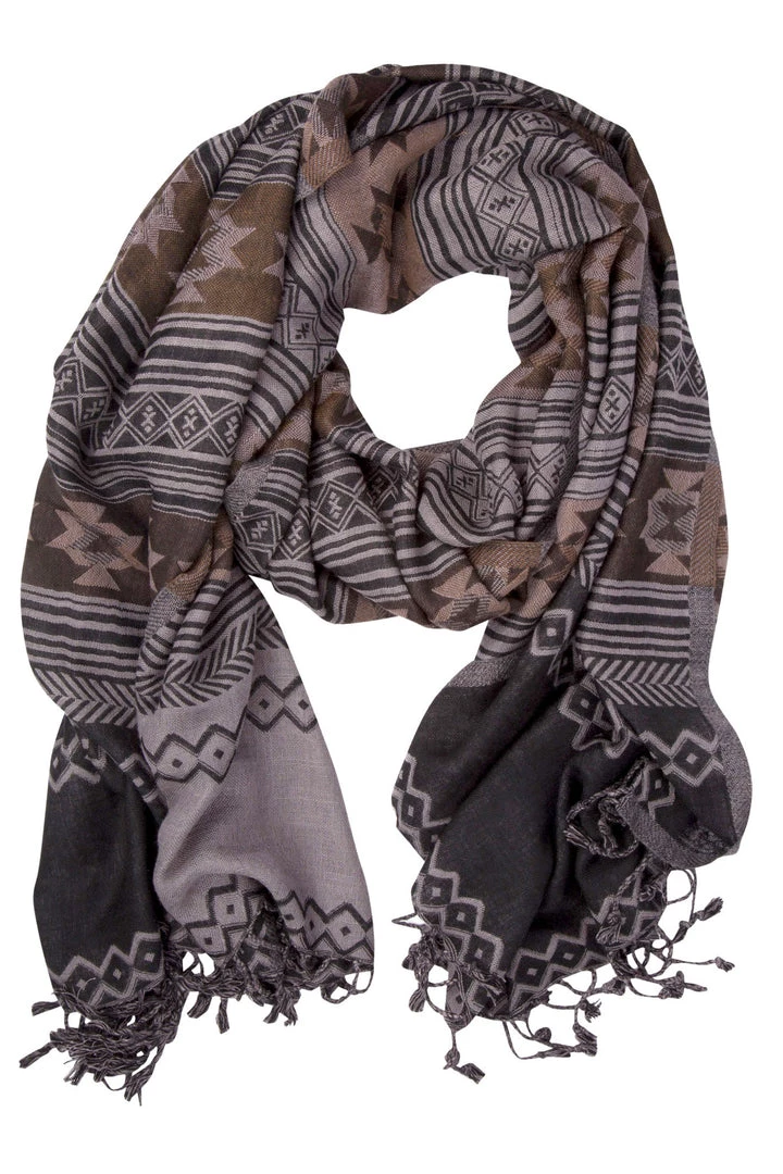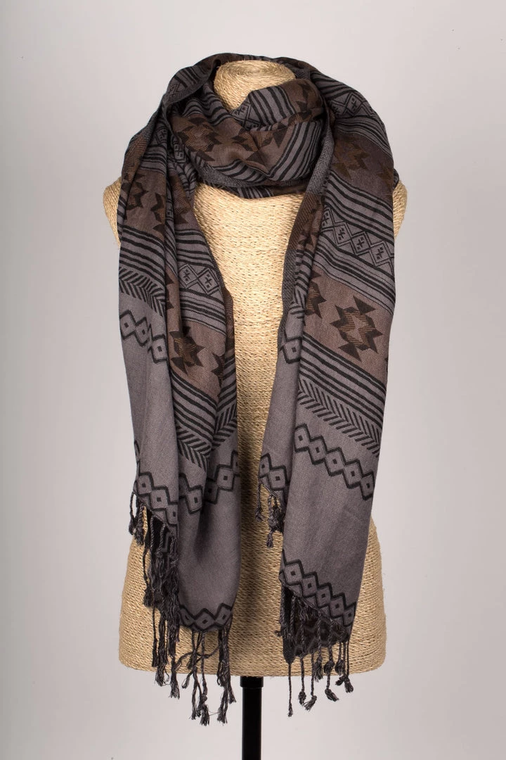 - Hand-woven viscose/wool blend scarf with gray, black, and brown geometric jacquard pattern