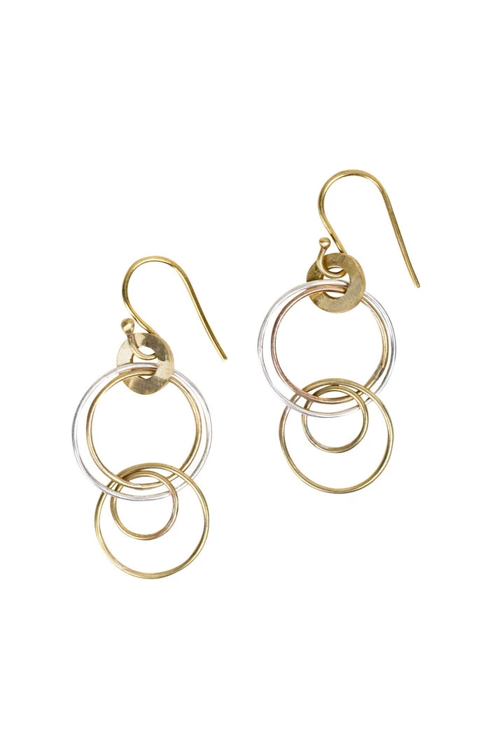 The Linked Hoops Earrings features a cascade of rings. These earrings are made from upcycled bombshell brass and sterling silver. Decades of conflict have left the countryside of Cambodia littered with bombs—some still dangerous, all a reminder of violence. One by one, the makers at our fair trade partner Rajana cut and shape brass bomb casings, safely cleared by a demining agency, into jewelry — wearable statements of peace and progress. A beautiful Global Fair Trade gift.