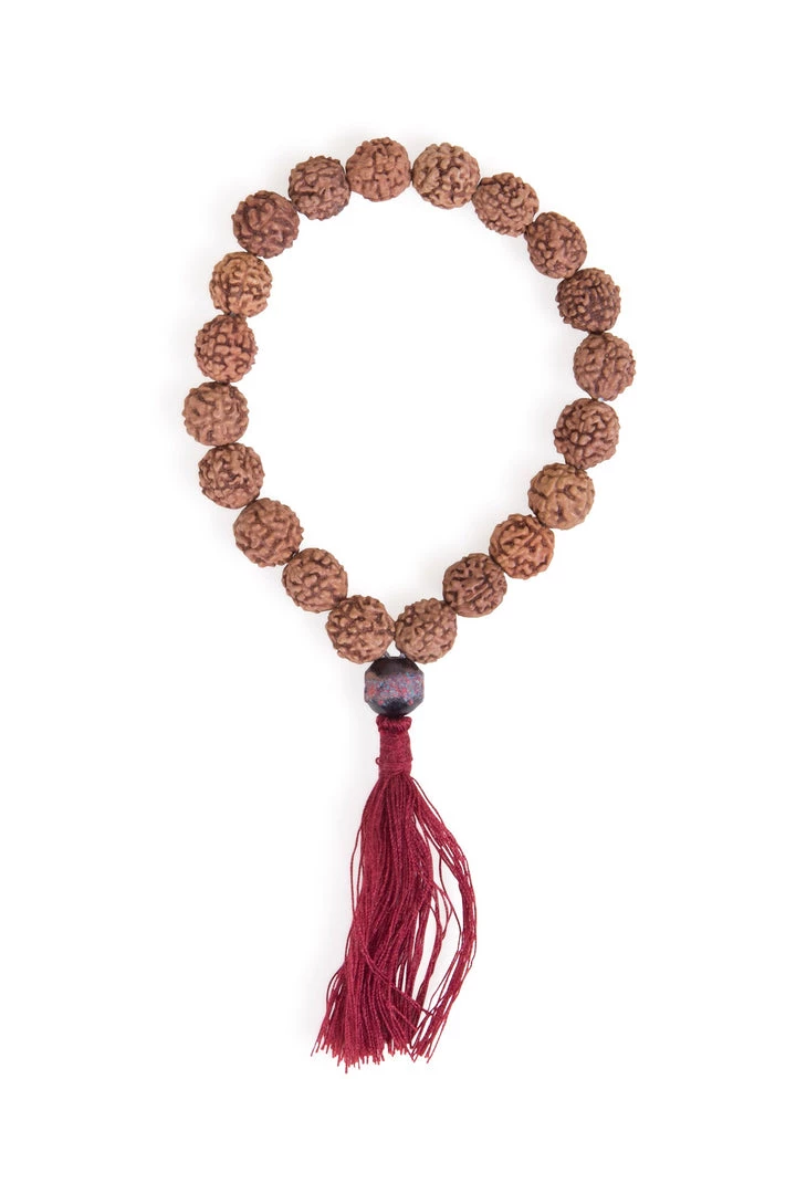 - Elastic bracelet with 20 rudraksha seed beads, one saaj wood bead with powdered turquoise and coral filling, and a burgundy-colored cotton tassel