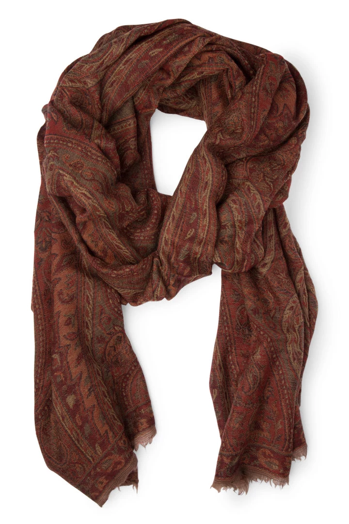 - Hand-woven paisley patterned scarf in rust and earth tones
