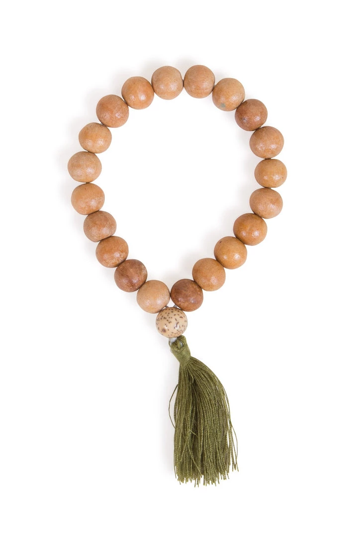 - Elastic bracelet with 20 light brown utis wood beads, 1 lotus seed bead, and a sage-colored cotton tassel