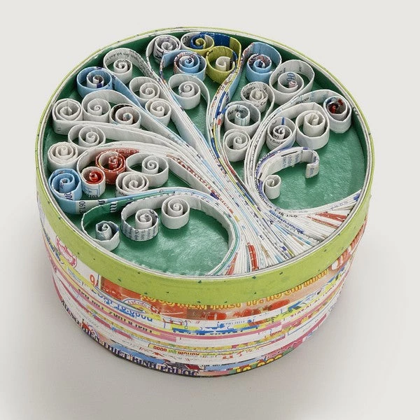 Resourceful artisans use innovative materials to create unique pieces such as this adorable paper box. Crafted from pages of recycled magazines, and decorated with an intricate tree design, this lidded box is the perfect place to stowe small treasures. Or use it as a gift box so that the presentation becomes part of the gift. An eco-friendly choice for the earth-conscious shopper. A Global Fair Trade gift.