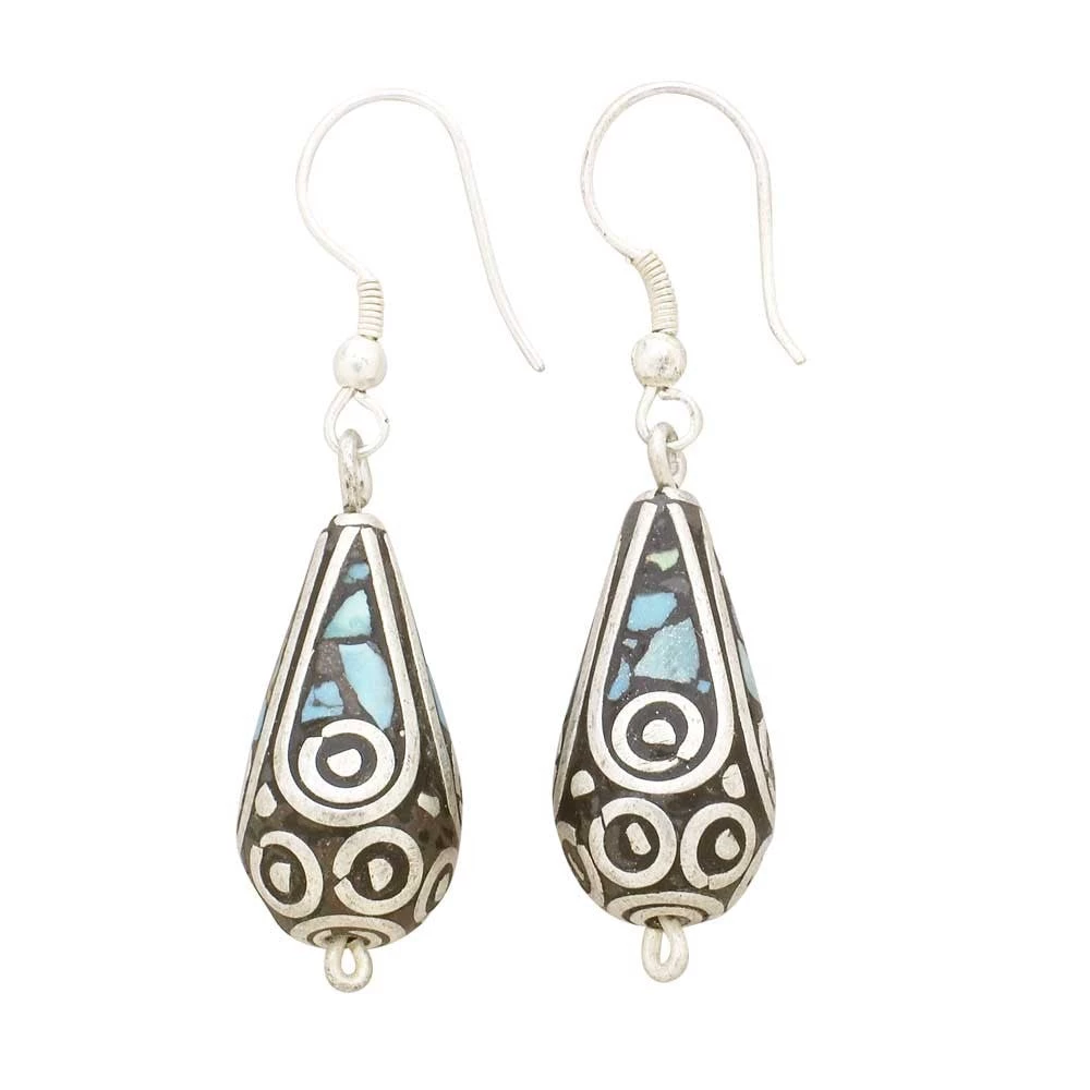Three-dimensional teardrop earrings feature silver scrollwork on black, with mosaic pieces of turquoise. A beautiful Global Fair Trade gift.
