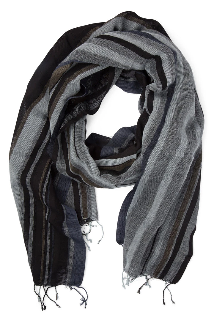- Fringy black, gray, blue gray, and taupe striped scarf